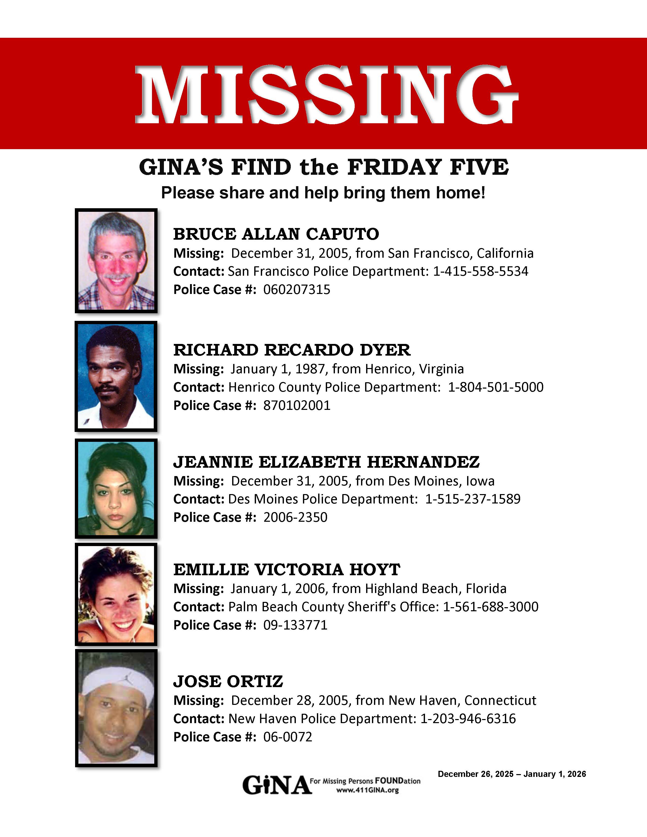 Content ©2003-2025 GINA for Missing Persons FOUNDation. All rights reserved. GINA is a 501(c)(3) nonprofit organization.